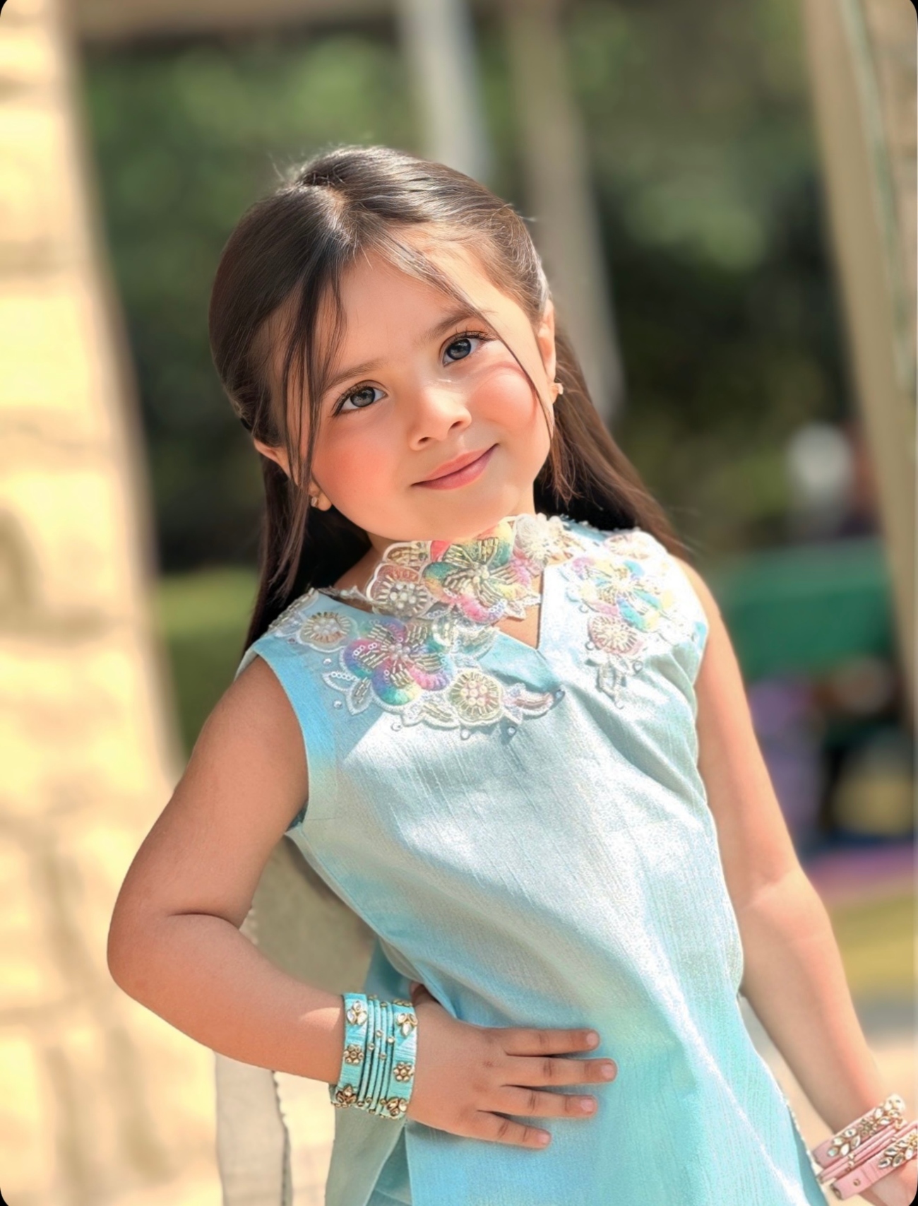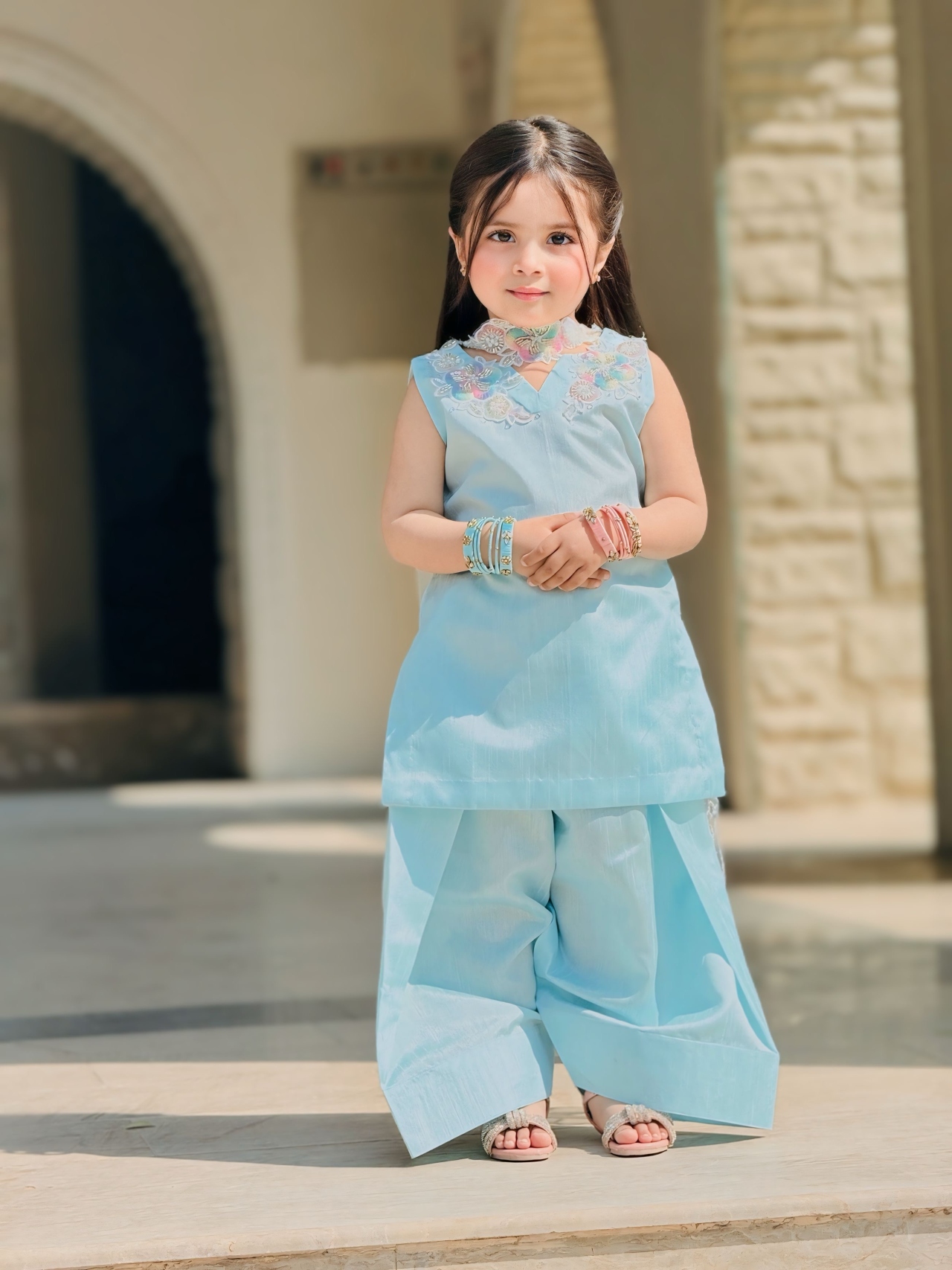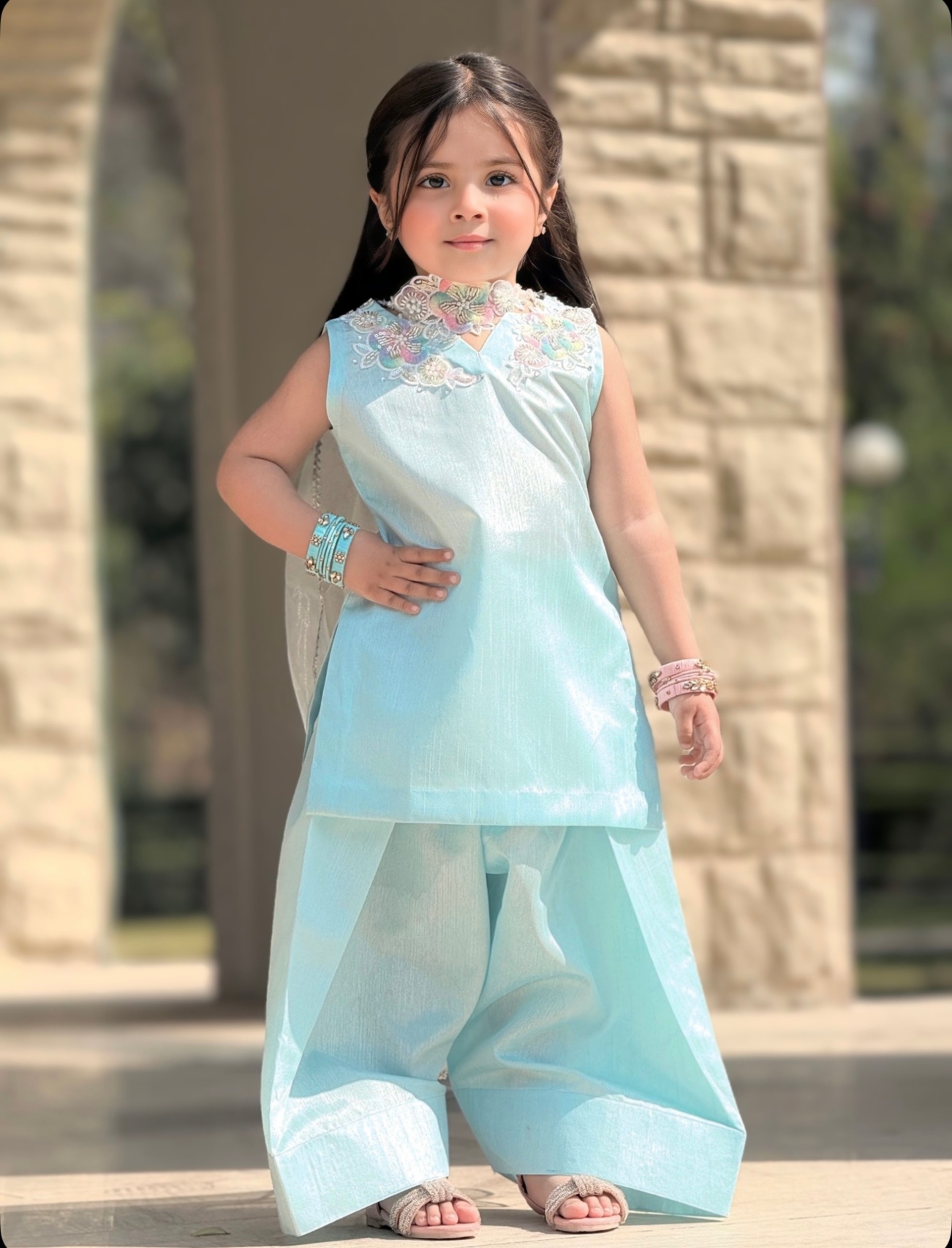 Soft sky blue in luxe raw silk, adorned with multi embellishments on shoulders.