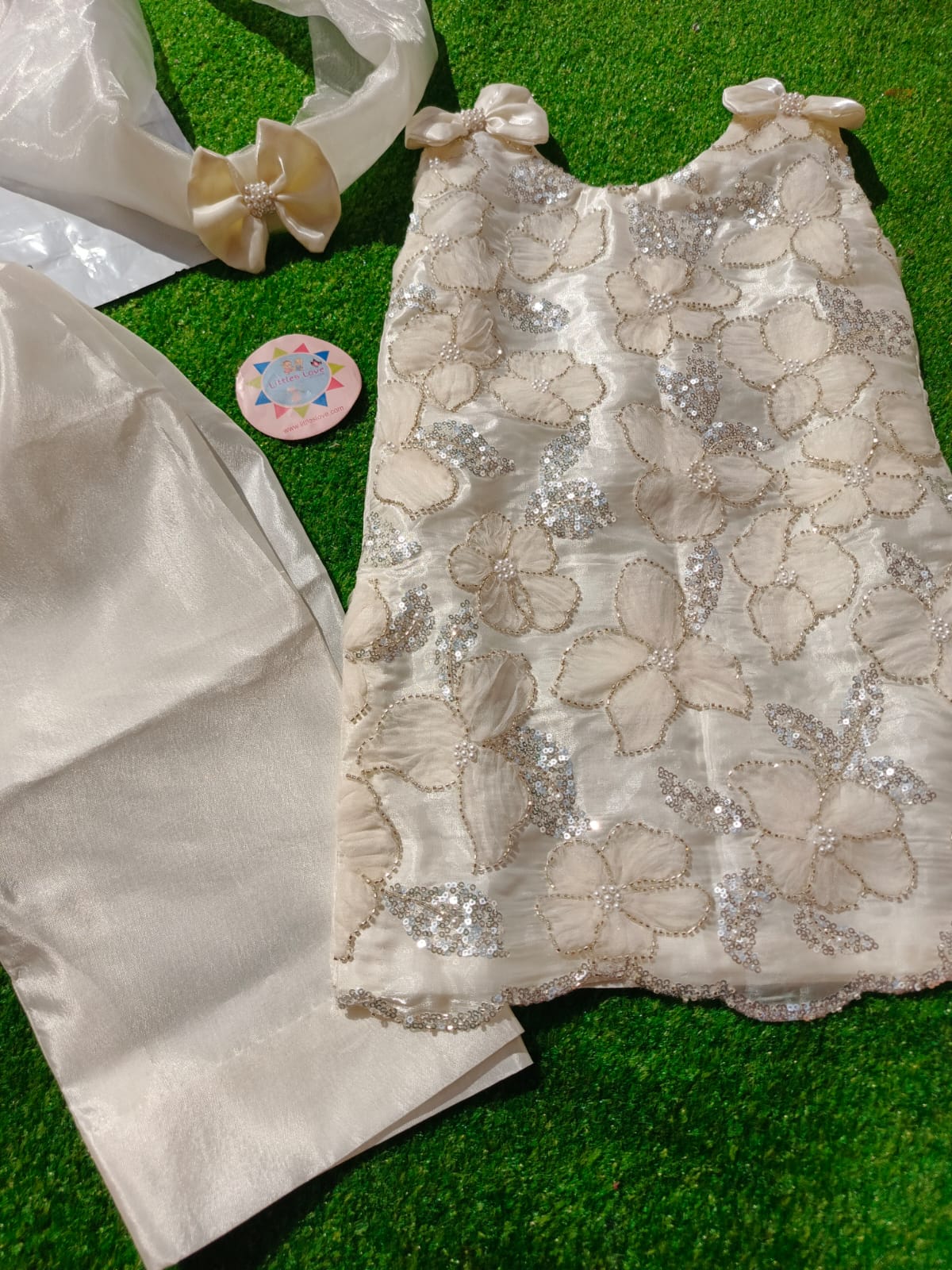 An elegant ivory ensemble adorned with intricate 3D floral detailing, creating a soft and luxurious look. Paired with a sleek bottom, this outfit is a perfect blend of grace and sophistication, ideal for festive and formal wear.✨
