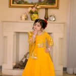 This stunning black outfit features intricate floral embroidery, gota work in golden and vibrant hues, paired with soft organza detailing that adds a magical flair.