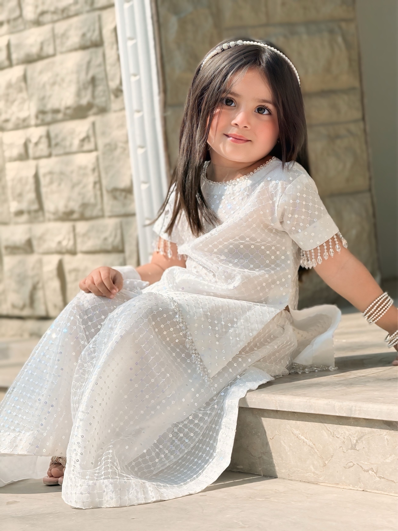 Drapped in luminous white with intricate sequins and crystals hangings, Noor. E. Safaid reflects timeless elegance and refined sparkle.✨
