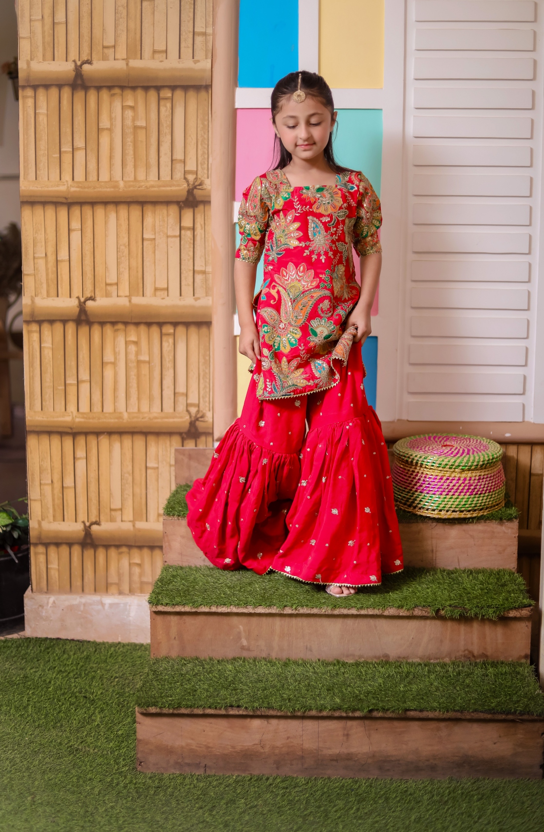 A radiant shocking pink sharara set adorned with intricate Indian zari work on shirt, inspired by Indian craftmanship. A perfect blend of desi,elegance and modern grace, ideal for weddings and Celebratory occasions.
