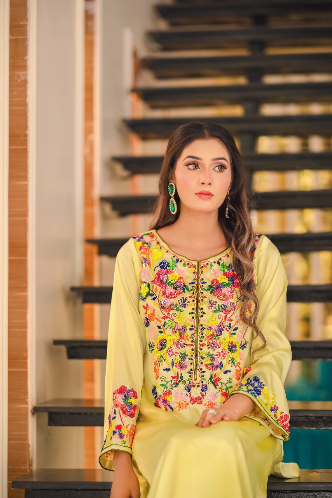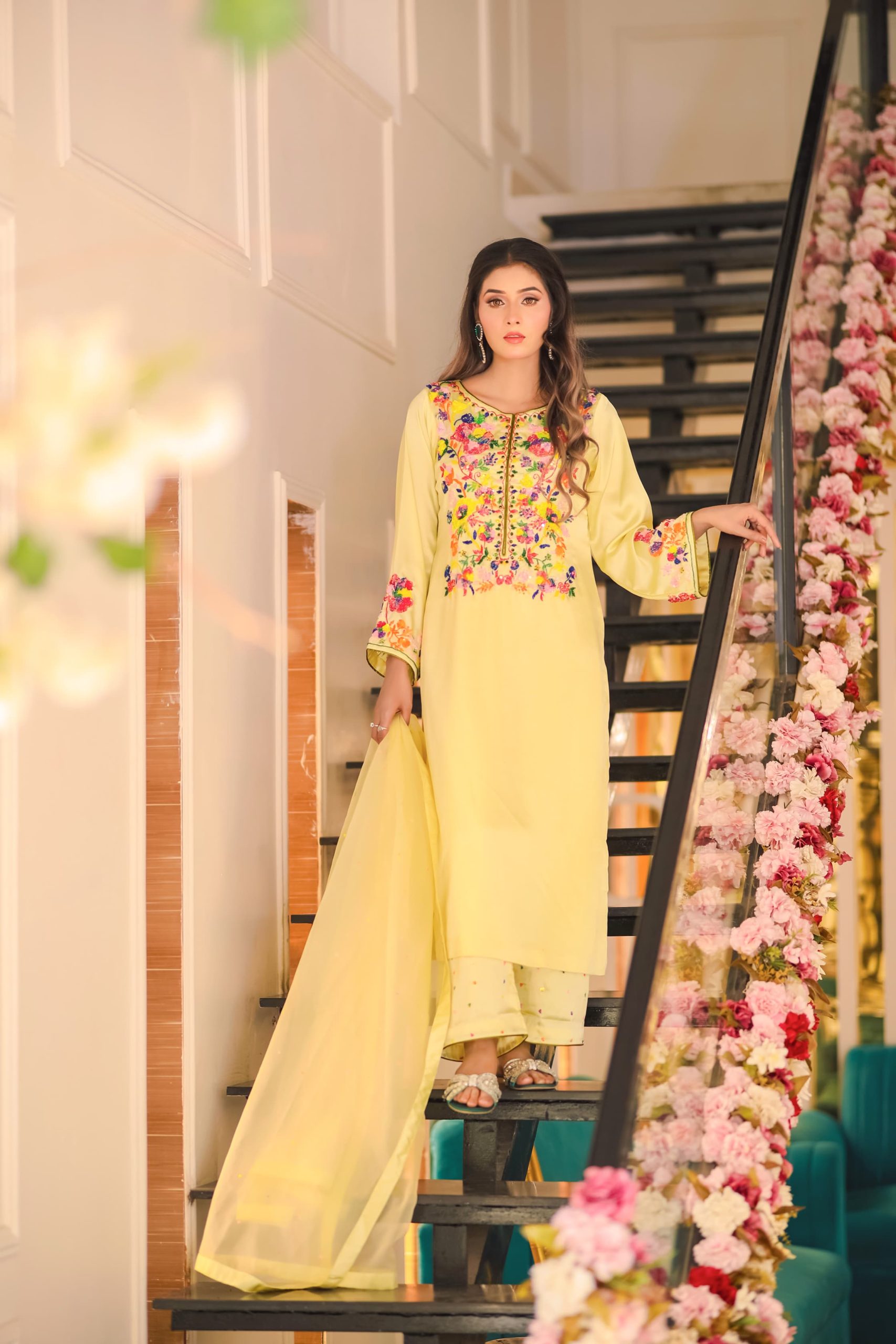 This stunning lime ensemble features exquisite handwork adorned with multi-colored sequins, sparkling stones, and delicate cut-moti detailing — a perfect harmony of vibrance and grace.