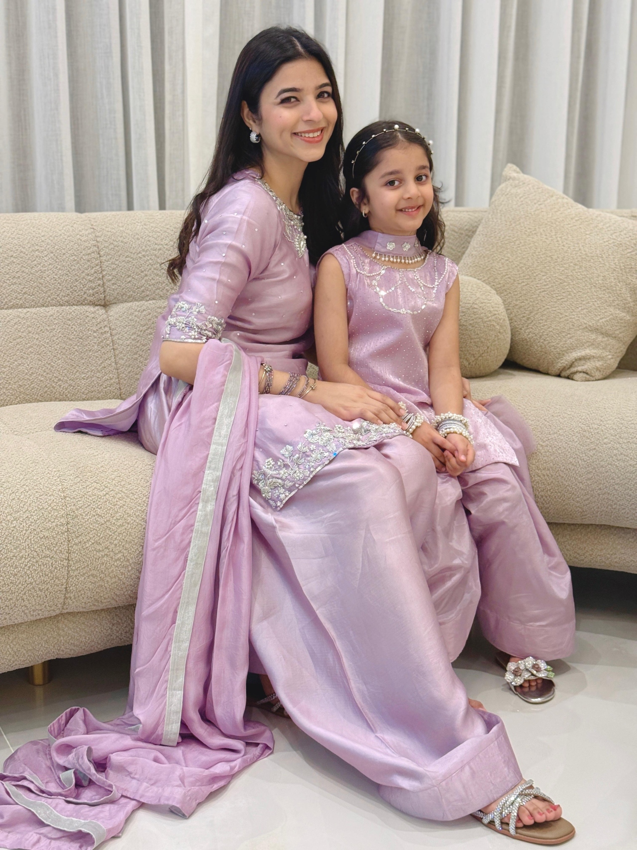 A soft lilac ensemble adorned with delicate silver adda handwork, giving it a subtle yet Royal charm. Perfect for an elegant and gracefull look.