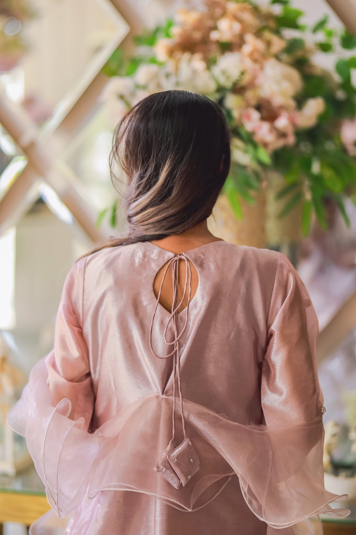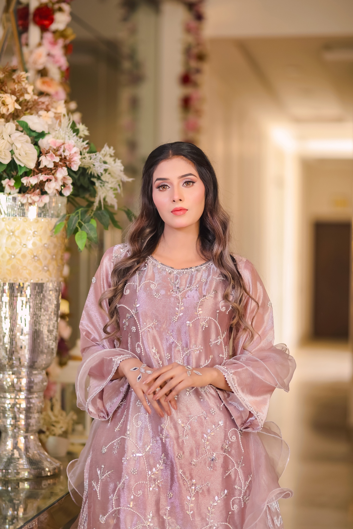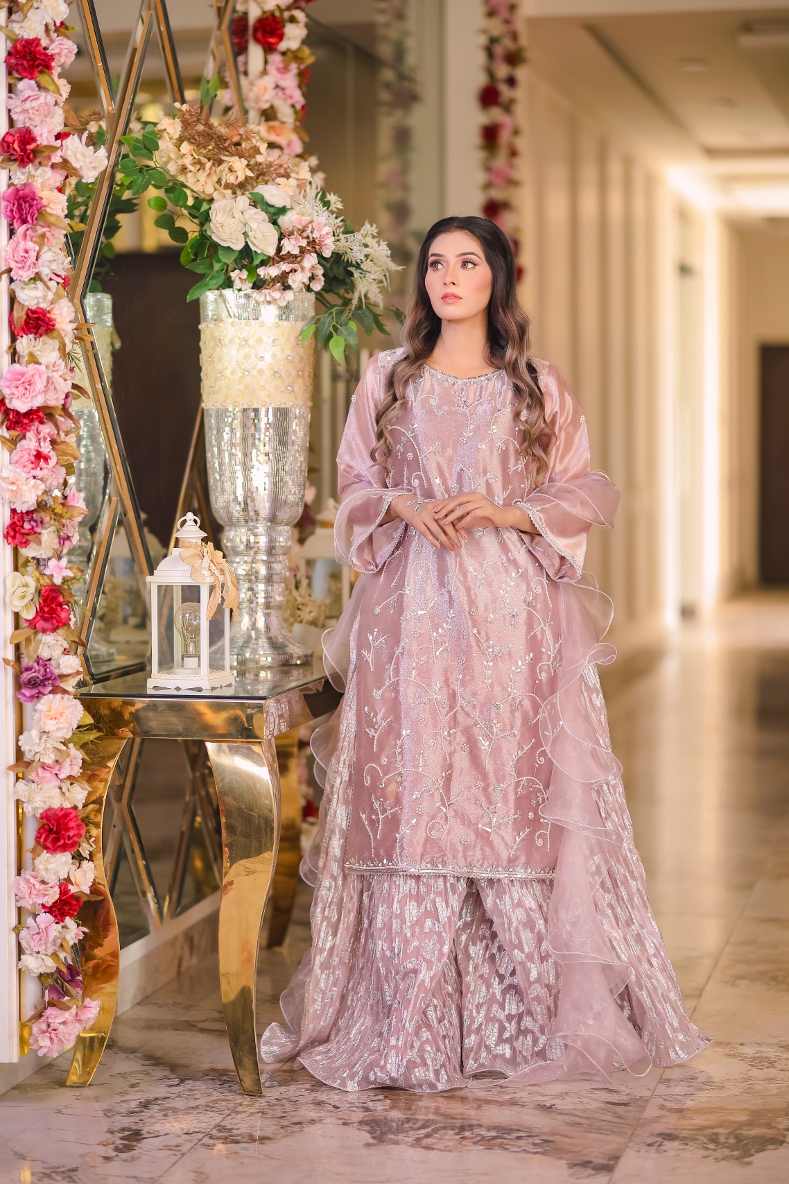 A dreamy tea pink ensemble adorned with exquisite adda work