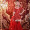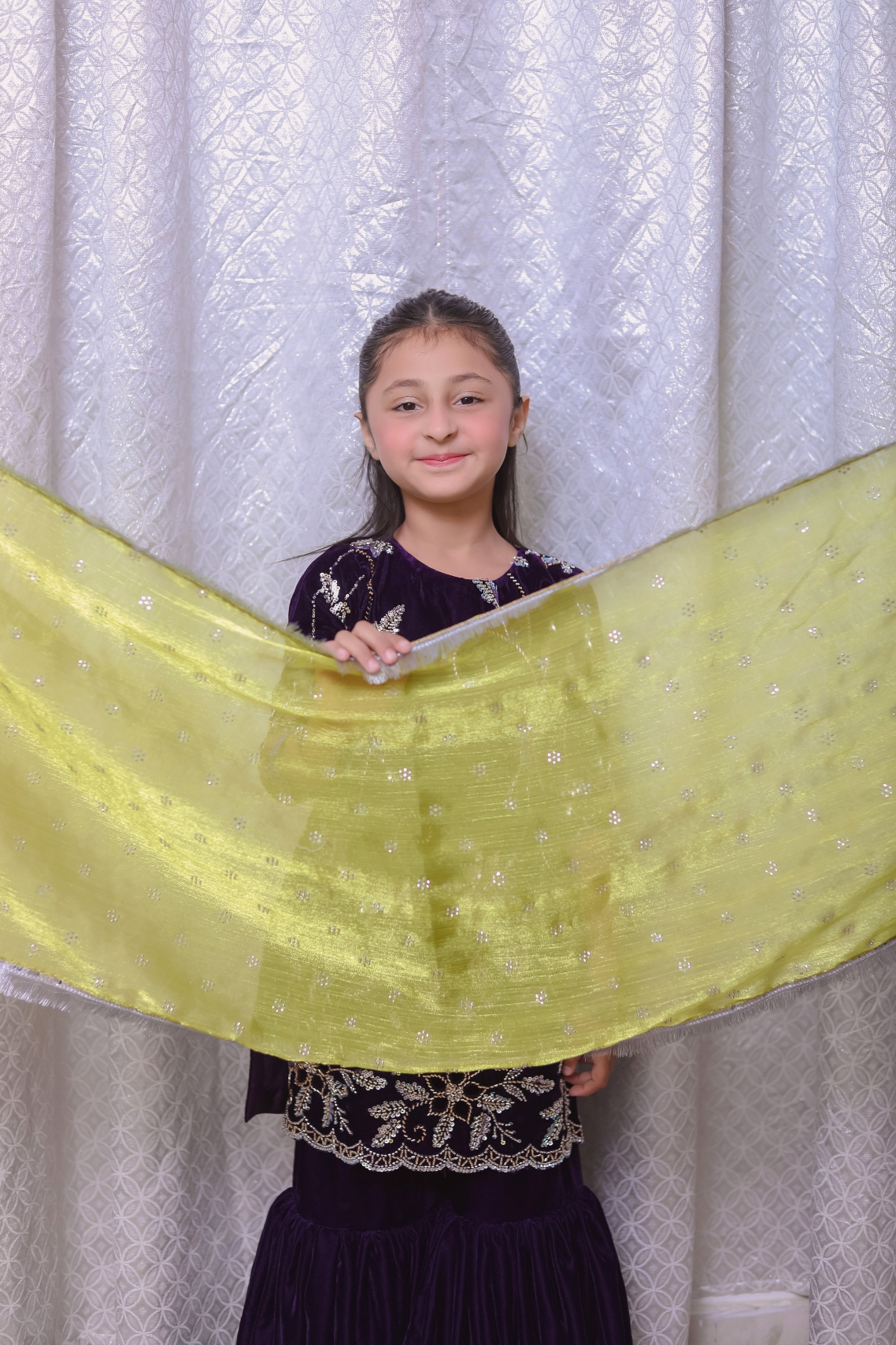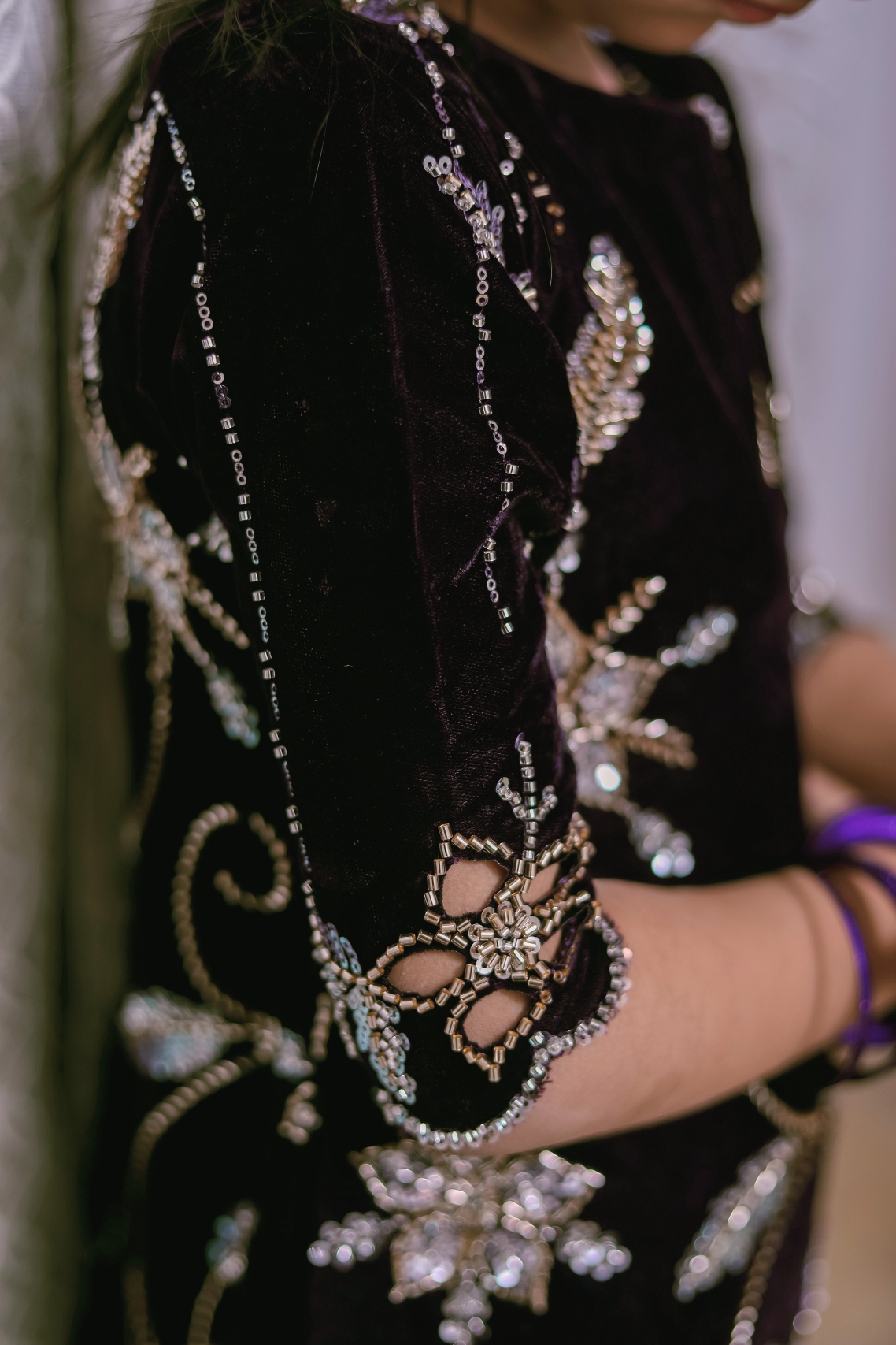 A stunning dark-purple velvet ensemble adorned with delicate cut-moti, sequins, and crystal handwork that shines like scattered stars. The full-flaired sharara adds a majestic royal charm, giving the outfit a graceful and luxurious fall. Perfect for evening festivities with an enchanting, regal glow.