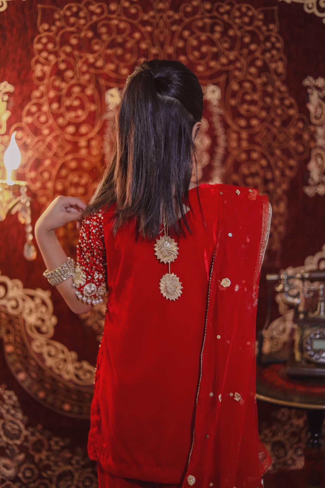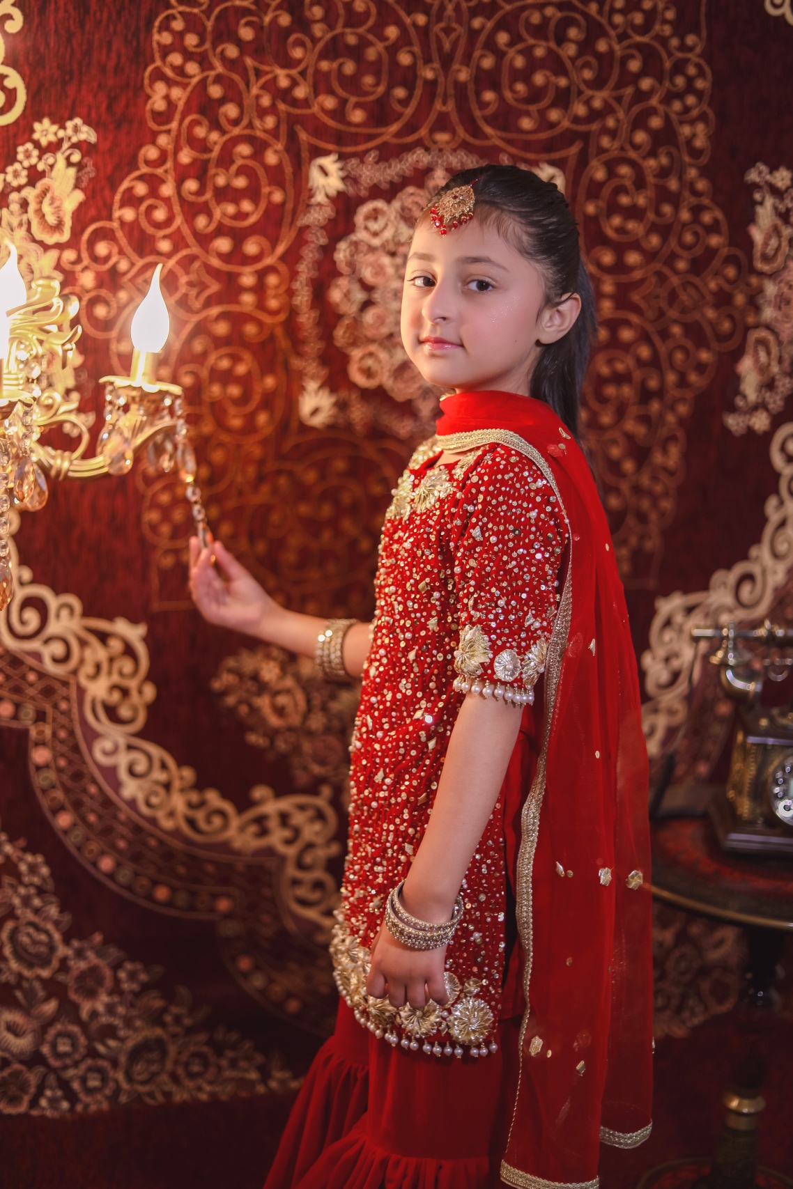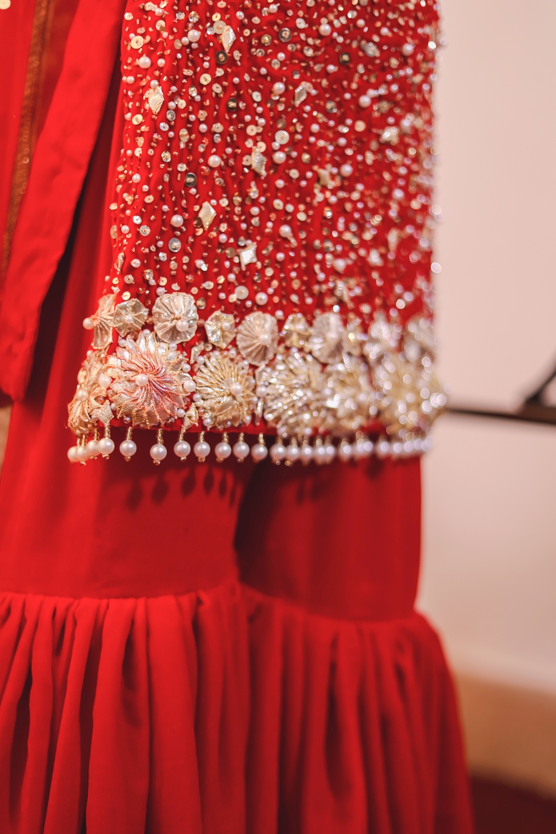 “Surkh Gulab” is a stunning masterpiece crafted on rich red velvet, adorned with intricate handwork using gota, crystals, pearls, sequins, and stones. The delicate embellishments shine softly like light falling on rose petals, giving the outfit a royal, graceful, and timelessly elegant look.