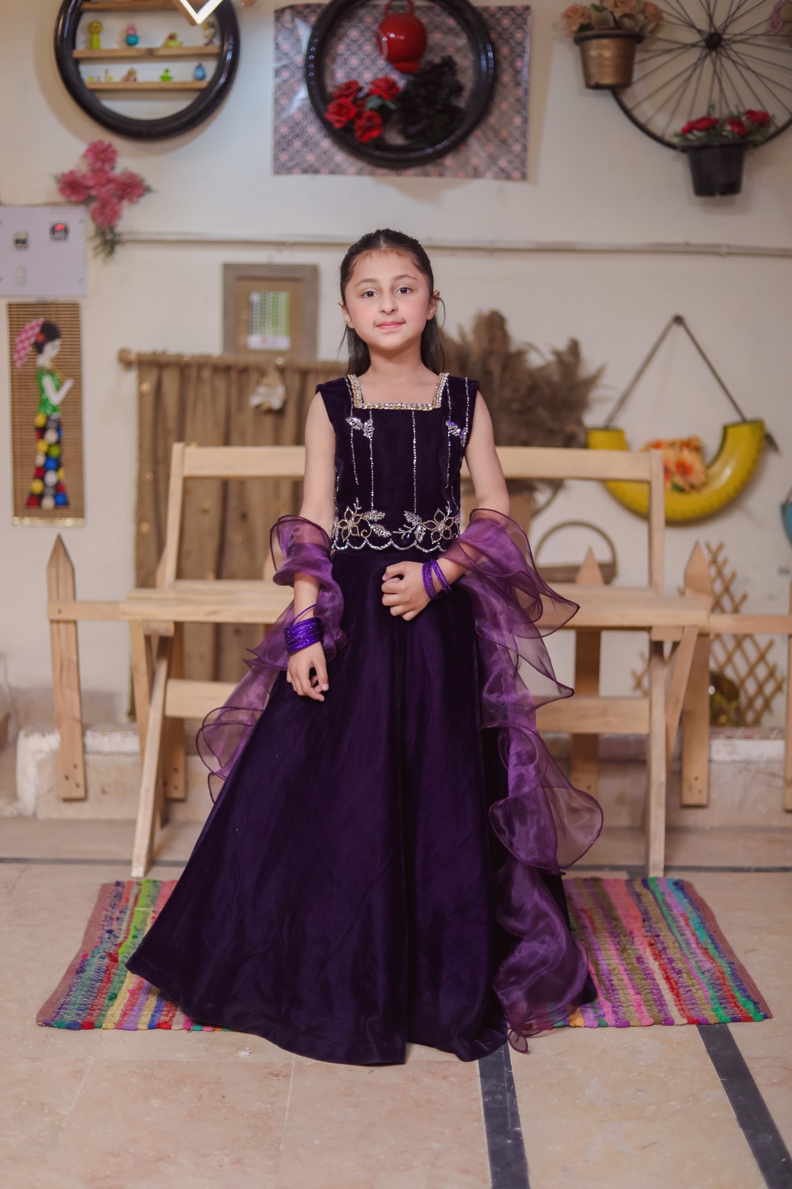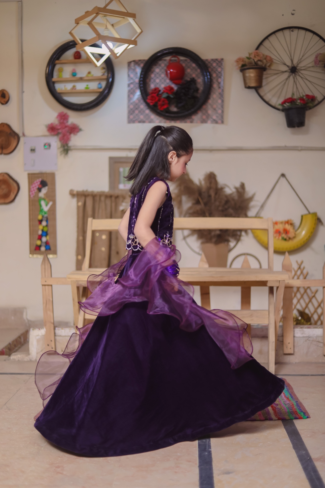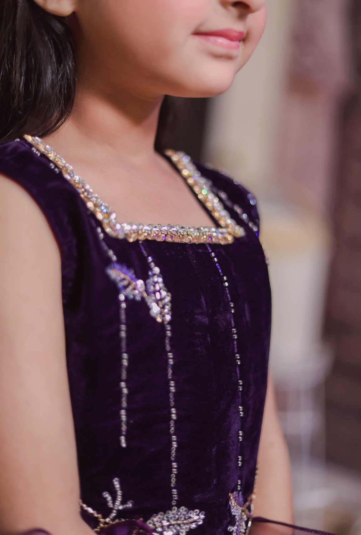 “velvet sitara” is a stunning masterpiece crafted on rich dark purple velvet, adorned with intricate crystals, pearls, sequins, and stones. The delicate embellishments shine softly like light falling on rose petals, giving the outfit a royal, graceful, and timelessly elegant look.